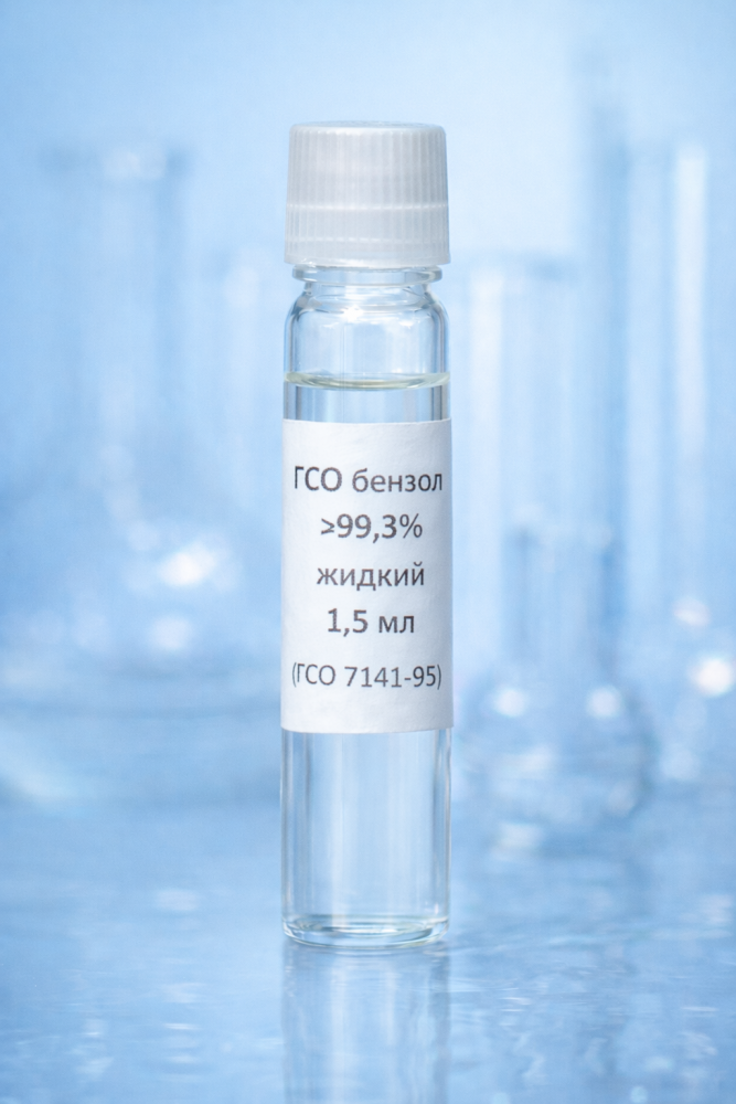 ГСО бензола (более 99,3%, жидкий, 1,5 мл) с номером ГСО 7141-95 — это стандартный образец состава бензола, предназначенный для контроля точности результатов измерений, установления и контроля стабильности градуировочной характеристики, аттестации методик измерений, поверки и калибровки средств измерений, а также для испытаний средств измерений в целях утверждения типа.