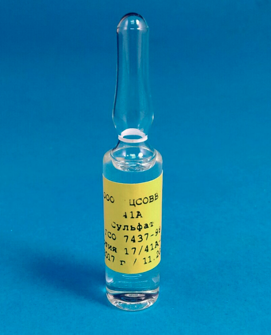 ГСО сульфат-ионов с концентрацией 10 г/л, фон-вода (5 мл) (ГСО 7437-98) — это государственный стандартный образец состава водного раствора сульфат-ионов с массовой концентрацией 10 г/л (10 мг/см3), который предназначен для градуировки и калибровки средств измерений, в том числе специализированных, используемых при определении содержания сульфат-ионов в водных средах ионно-хроматографическим, капиллярно-электрофоретическим, турбидиметрическим, спектрофотометрическим, фотоколориметрическим и другими методами, контроля метрологических характеристик средств измерений при проведении их испытаний, в том числе в целях утверждения типа, а также для аттестации соответствующих методик измерений и контроля точности результатов таких измерений.