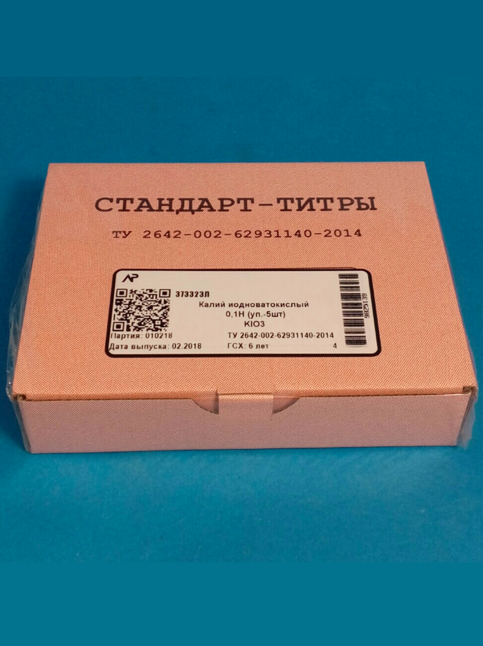 Применяются в лабораторной практике для количественного химического анализа. Стандарт-титры калия иодноватокислого используются для титриметрического анализа. В ходе такого исследования готовится стандартный раствор с известной концентрацией. Получают его путем растворения содержимого ампулы в мерной колбе в литре жидкости. Сухое вещество реактива находится в герметичной пластиковой ампуле. Коэффициент поправки — 1,00 ± 0,01 ГОСТ ТУ 2642-002-62931140-2014 С этим товаром смотрятОтзывы о Калий иодноватокислый 0,1Н (уп.-5 шт)Отзывов пока не было. Вы можете оставить его первым