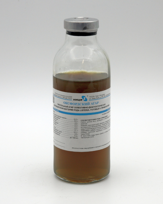 Оксфордский агар — это готовая к применению селективно-диагностическая среда, которая используется для выявления бактерий рода Listeria, включая Listeria monocytogenes, в пищевой продукции. Специальный пептон и растворимый крахмал являются источниками углерода, азота, витаминов и факторов роста. Хлорид натрия поддерживает сбалансированное осмотическое давление. Listeria гидролизуют эскулин до эскулетина, который реагирует с ионами железа с образованием черного 6,7-дигидроксикумарина, окрашивающим среду вокруг колоний. Хлорид лития и антибиотики ингибируют рост бактерий, не являющиеся Listeria spp. Коагулянтом среды является агар.