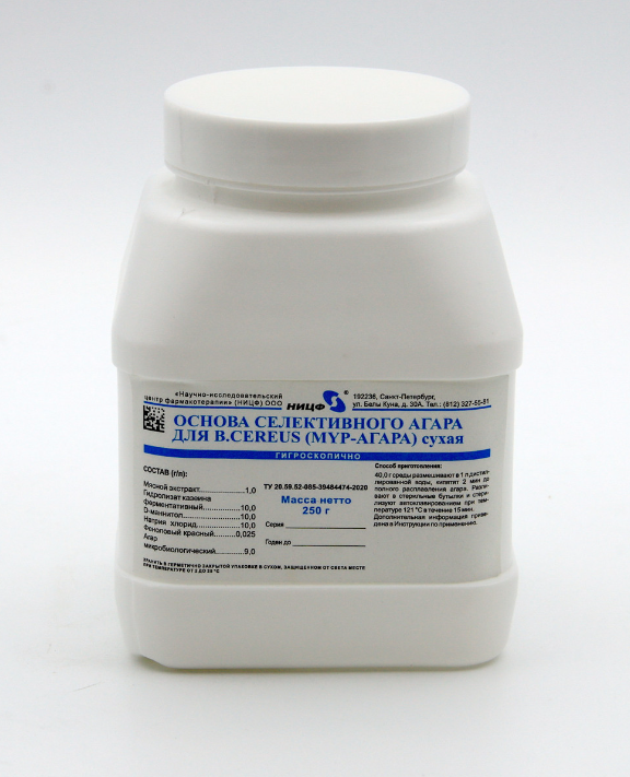 Основа селективного агара для Bacillus cereus (MYP- агара) сухая (ГОСТ ISO 21871-2013) — это сухая питательная среда, которая применяется при испытаниях проб пищевых продуктов и кормов для животных, проб из окружающей среды, отобранных из зоны производства и переработки пищевых продуктов, для выделения и количественного подсчета жизнеспособных презумптивных Bacillus cereus путем подсчета колоний, выросших на плотной питательной среде при температуре 30 °C.
