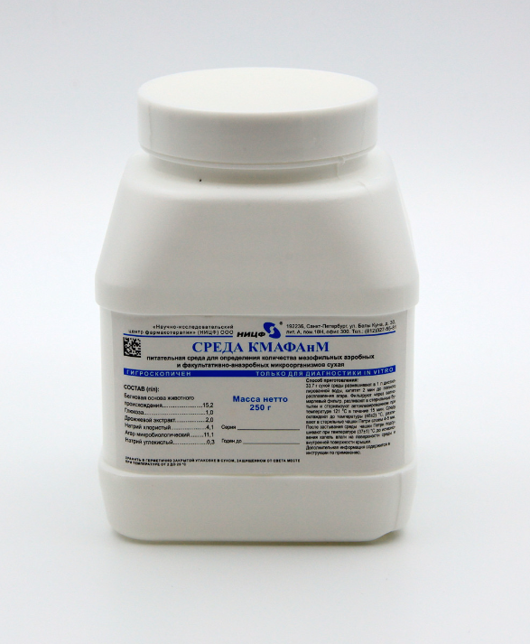 Питательная среда для определения количества мезофильных аэробных и факультативно-анаэробных микроорганизмов сухая (Среда КМАФАнМ) — это сухая питательная среда, которая используется для культивирования мезофильных аэробных и факультативно-анаэробных микроорганизмов и их количественного подсчета при микробиологическом контроле пищевых продуктов, фармацевтических препаратов и объектов окружающей среды. Ее состав включает белковую основу животного происхождения в качестве источника аминокислот и пептидов, глюкозу — энергетический субстрат для метаболизма микроорганизмов, дрожжевой экстракт для витаминов и ростовых факторов, натрий хлористый для поддержки осмотического баланса и натрий углекислый для стабилизации pH среды, а также микробиологический агар для формирования плотной питательной основы для роста колоний.