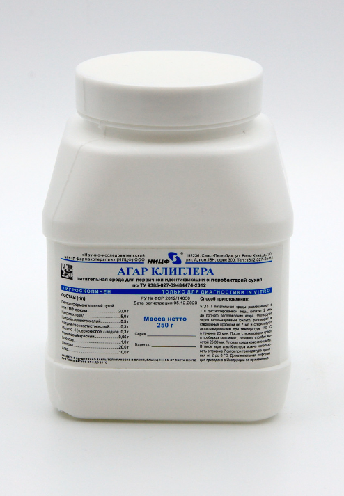 Питательная среда для первичной идентификации энтеробактерий сухая Агар Клиглера — это специализированная сухая питательная среда, которая применяется при исследовании клинического материала и образцов из объектов окружающей среды для первичной идентификации культур энтеробактерий по их способности к ферментации глюкозы и лактозы и образовывать сероводород.