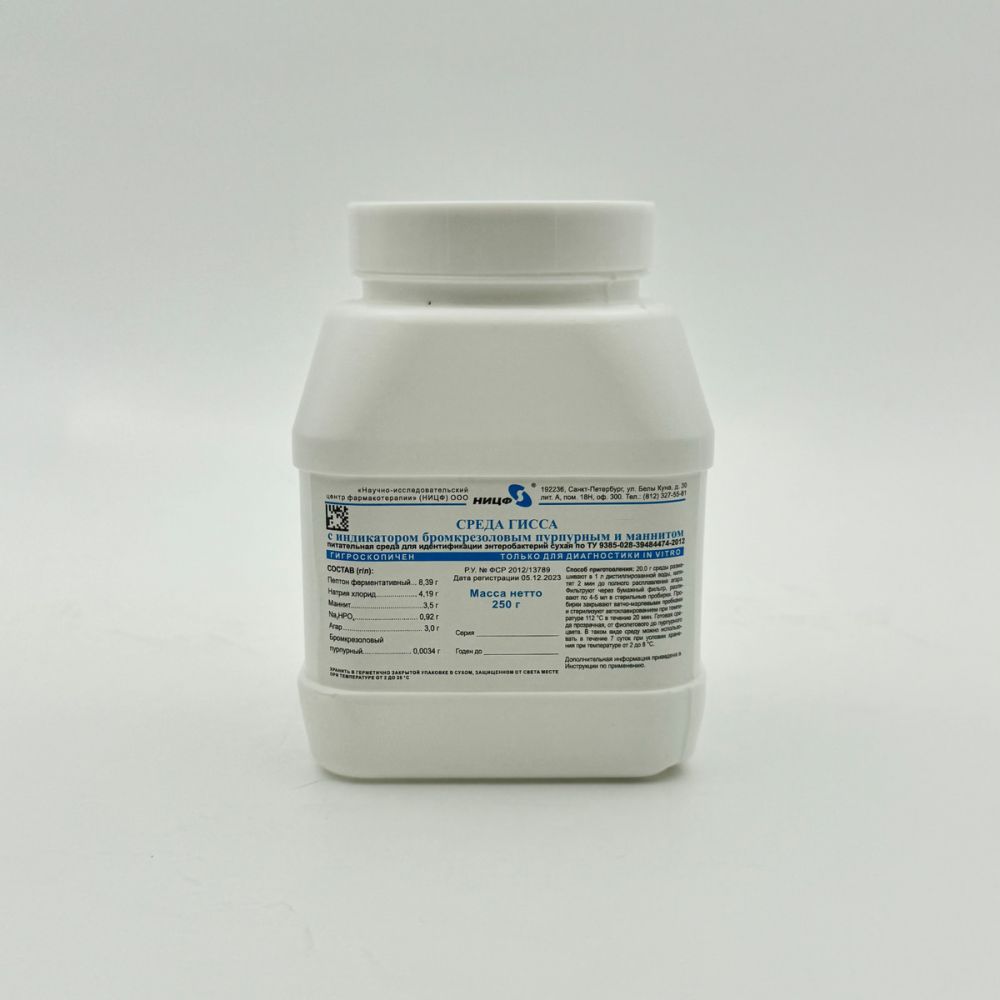 Описание Среда Гисса с бромкрезоловым пурпурным и маннитом, 250 грСреда Гисса с бромкрезоловым пурпурным и маннитом (0,25 кг)Назначение средыОсновное применение:
