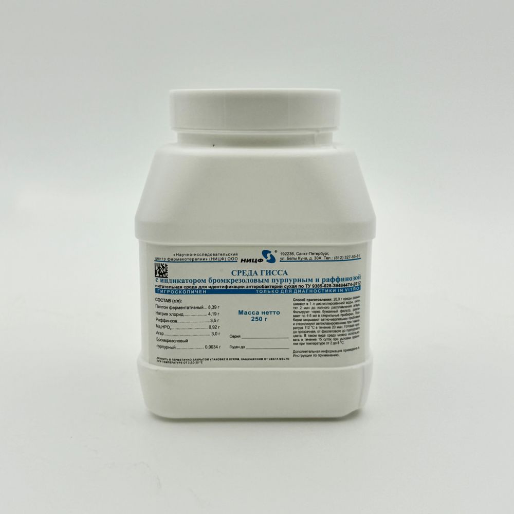 Описание Среда Гисса с бромкрезоловым пурпурным и раффинозой, 250 грСреда Гисса с бромкрезоловым пурпурным и раффинозой (0,25 кг)Назначение средыОсновное применение: