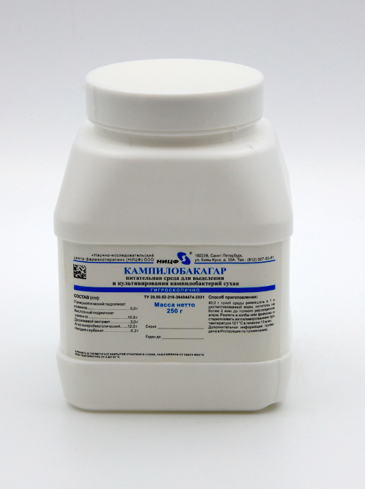 Среда для выделения и культивирования кампилобактерий Кампилобакагар — это сухая питательная среда, которая применяется для выделения и культивирования возбудителя кампилобактериоза из инфицированного материала и объектов внешней среды, а также для поддержания и размножения музейных штаммов и свежевыделенных культур кампилобактерий. При добавлении 7% дефибринированной крови барана среда обеспечивает полноценный рост кампилобактерий за счет необходимых факторов роста. Чтобы придать среде селективные свойства (подавить рост сопутствующей микрофлоры) допускается использование соответствующей селективной добавки по МУК 4.2.2321-08 (не входит в комплект поставки).