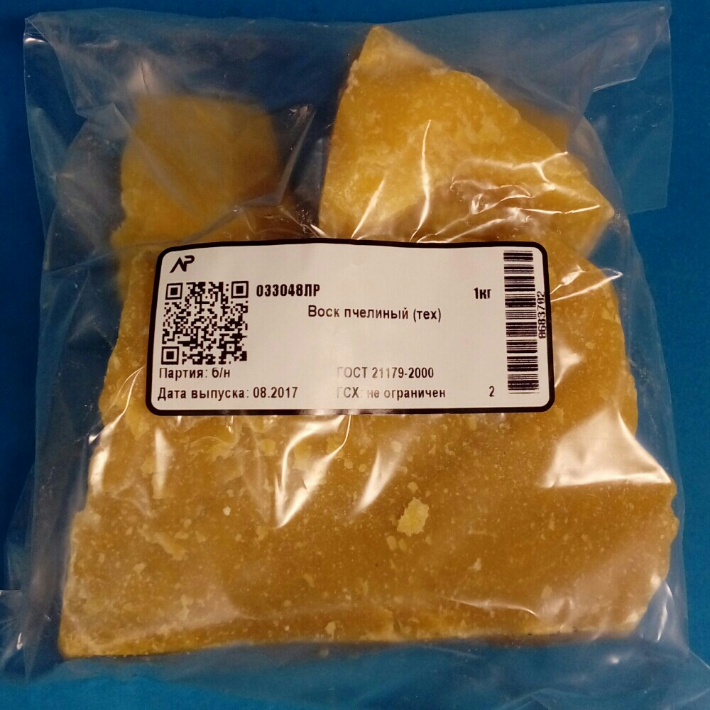 Описание Воск пчелиный производственный технический, 1 кгВоск пчелиный производственный технический (ГОСТ 21179-2000)Общая характеристикаПроизводственный пчелиный воск — продукт переработки воскового сырья, предназначенный для промышленного использования. Соответствует требованиям ГОСТ 21179-2000. Технические характеристики